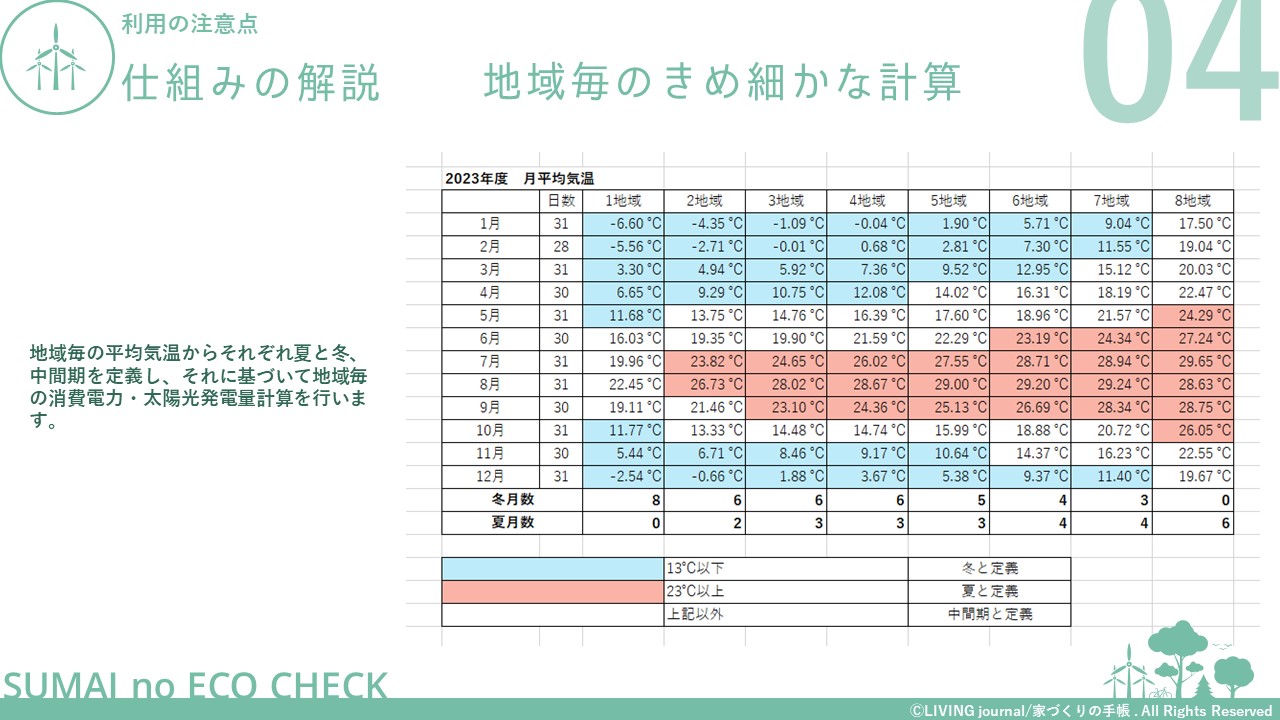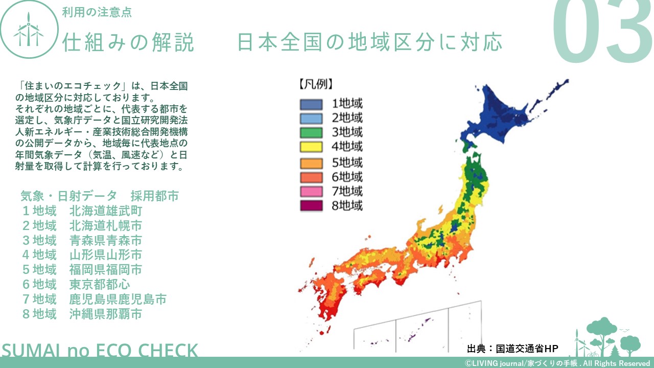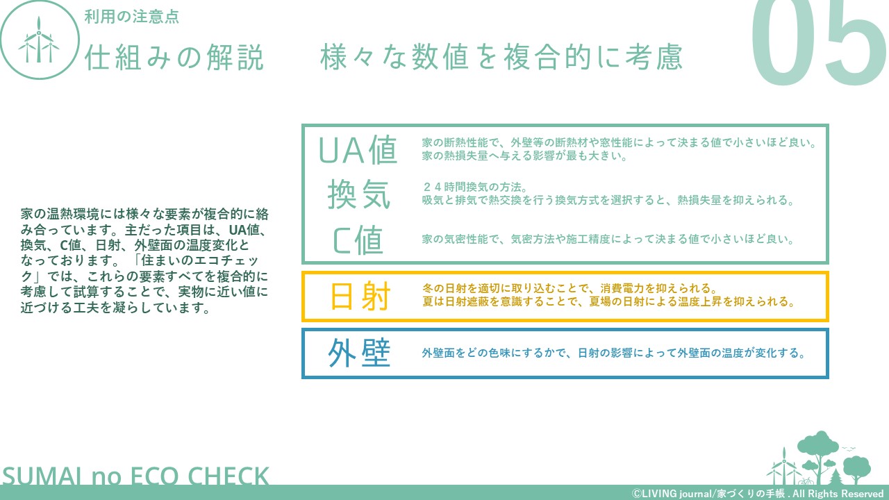 家づくりは、UA値やC値、日射遮蔽や外壁色の検討など、温熱環境の計画をするためにも相当勉強する必要がありますし、検討した内容がどのような効果があるのか、実際に住むまでわからない部分も多いかと思います。そこで、 「住まいのエコチェック」では、温熱環境の計画内容が消費電力や発電量に与える影響をあらかじめ計算できる仕組みをつくることで、皆様の家づくりの検討の一助となるように工夫しています。