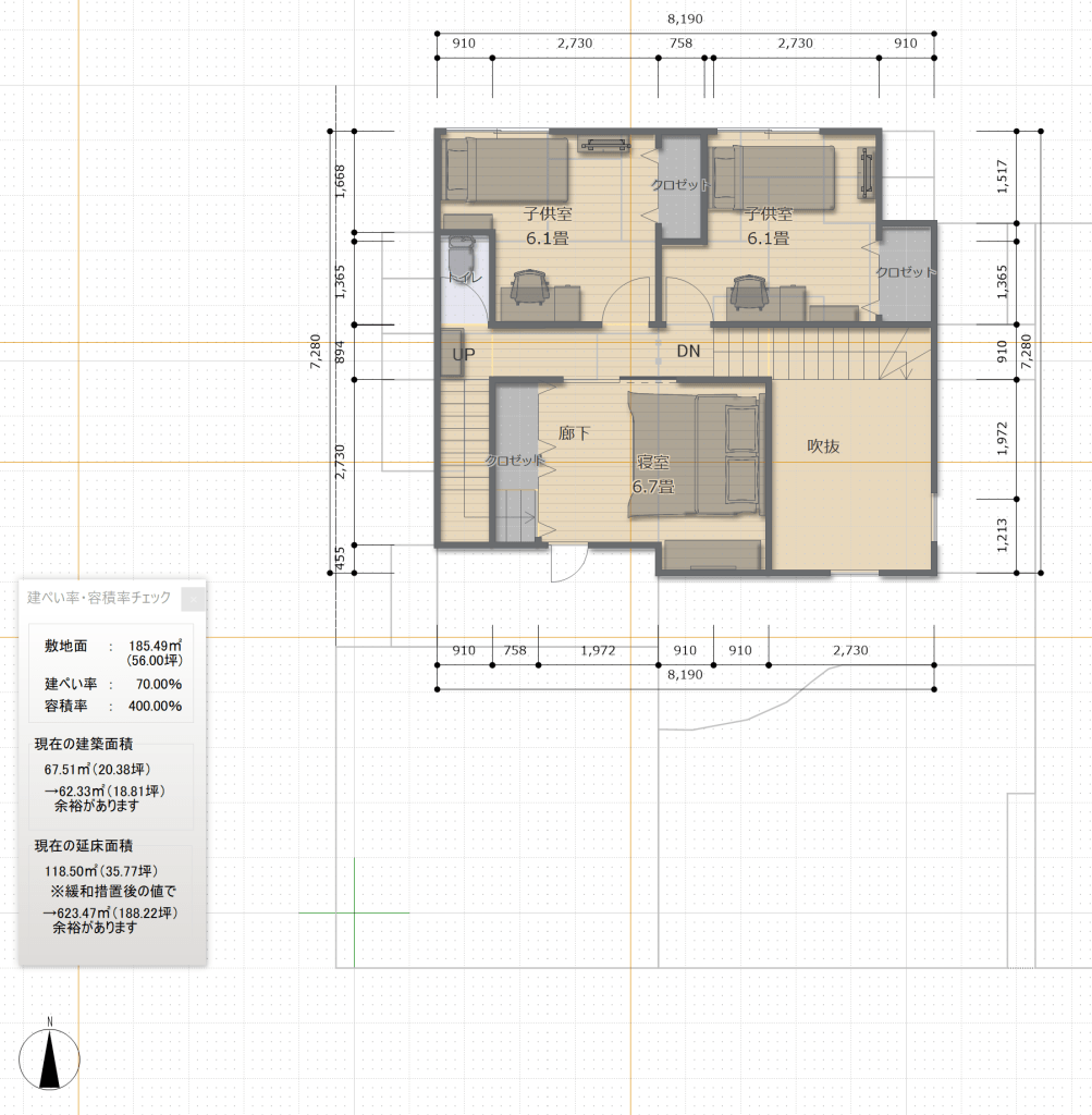 木造在来工法で、充填断熱とした場合に、断熱性能がどのようになるのか試算してみました。延べ床面積が108㎡、2階建ての住宅になります。