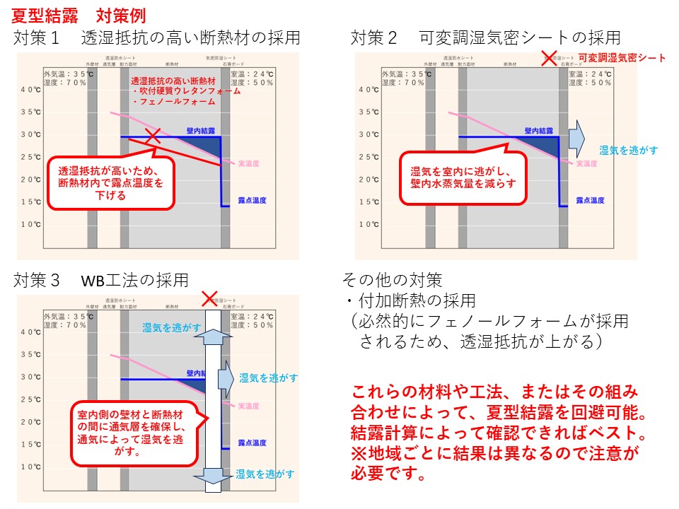 それでは、これを回避するためにはどうすれば良いのか。対策としては色々考えられますが、透湿抵抗の高い断熱材を採用したり、可変性調湿気密シートを採用したり、WB工法を採用したり、はたまたそれらを組み合わせる事によって対策を講じます(画像3枚目)。