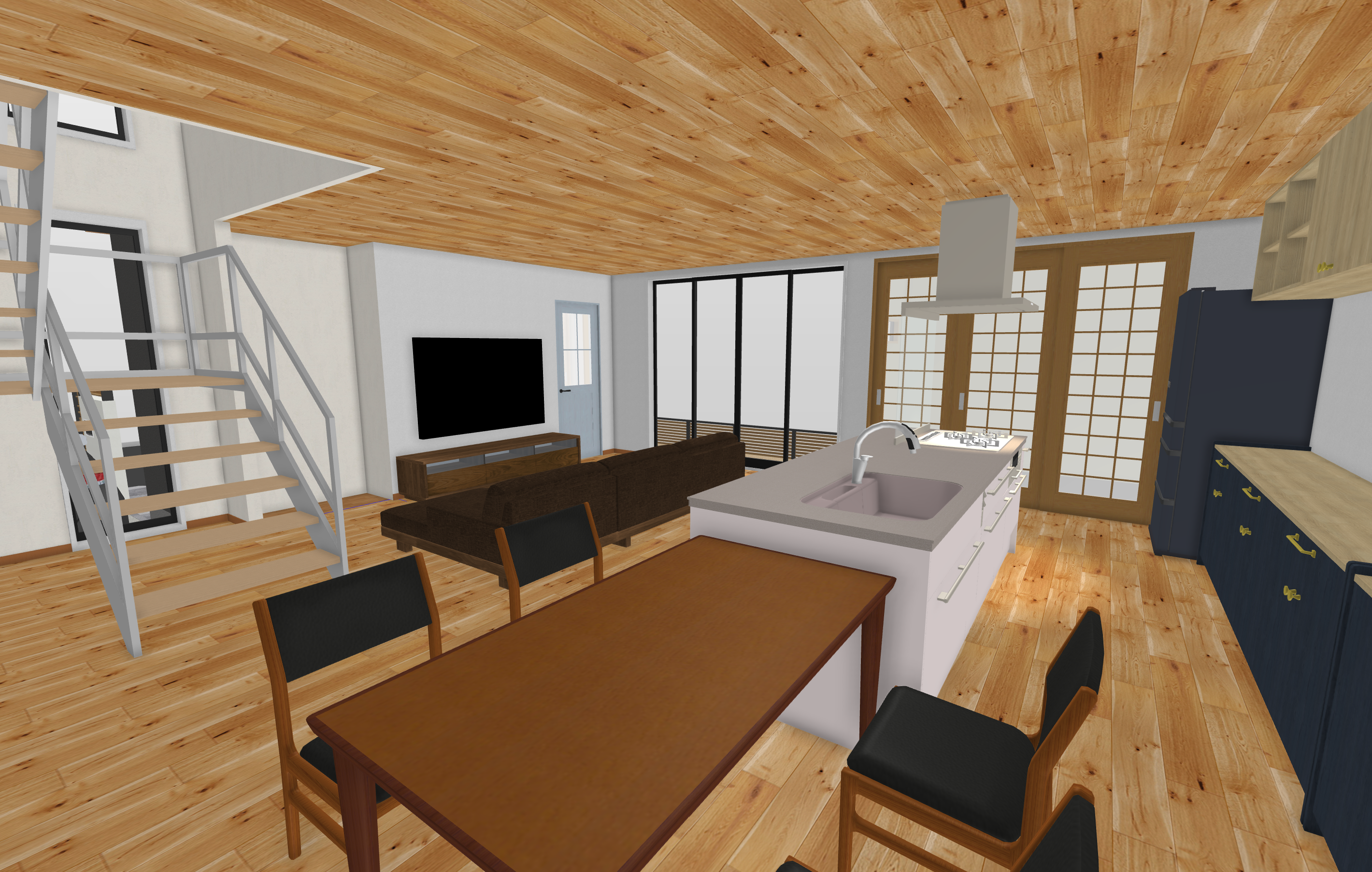 玄関入ってからの坪庭の確保、LDKの大空間の採用、洗面室やランドリールームの採用など、最近はやりのプランを詰め込みながらも、リビング階段を採用して坪数を削減し、総延べ床面積は130㎡と、比較的コンパクトに納めました(下の画像は2F部分)。このようにコンパクトな間取りでもSE工法の特徴を生かした大空間のLDKをプランニング可能なので、是非皆さん検討の一助としていただければと思います。