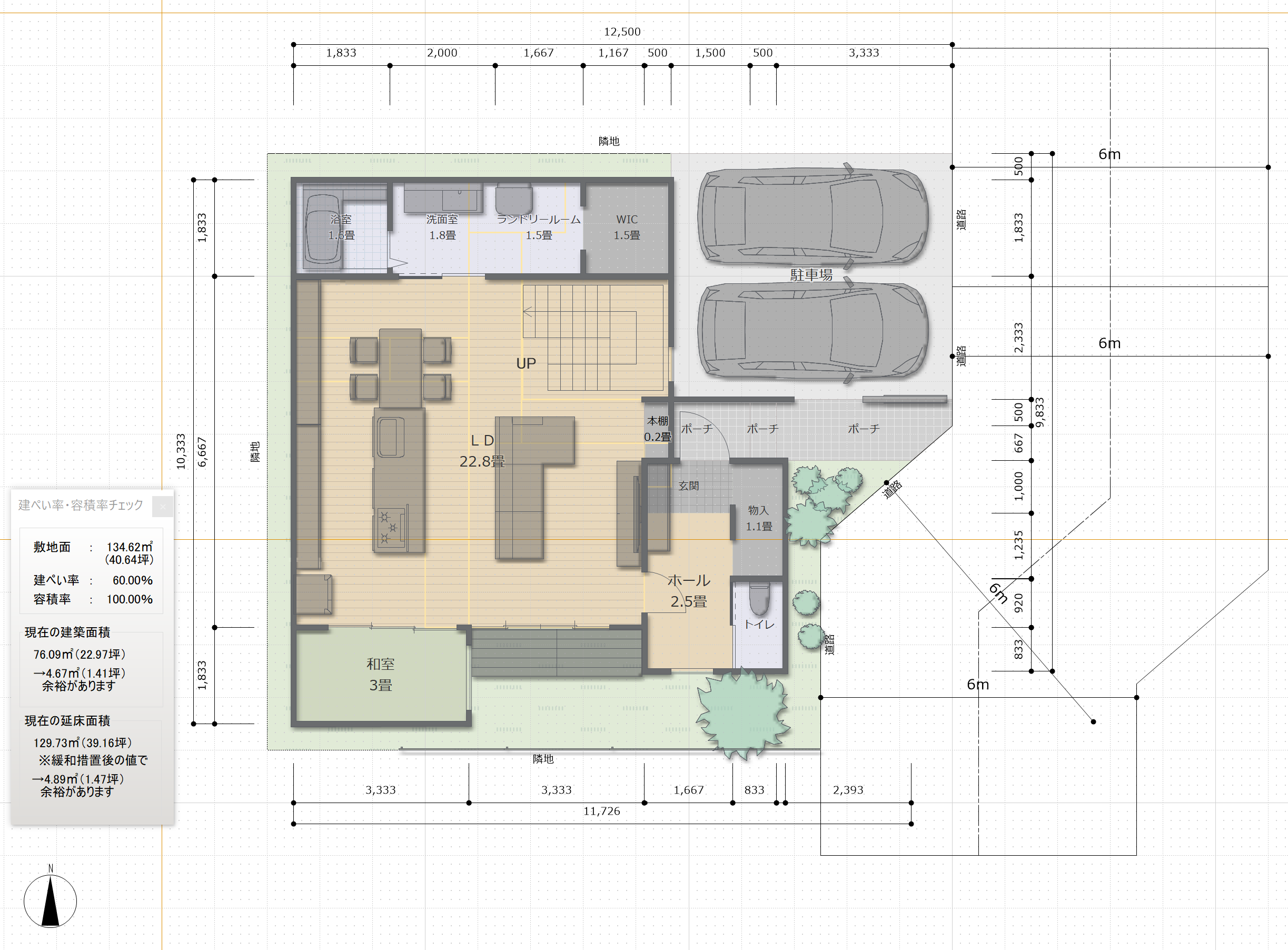敷地面積134㎡、建蔽率や容積率は比較的制限の緩い地域を想定しての設計になります。