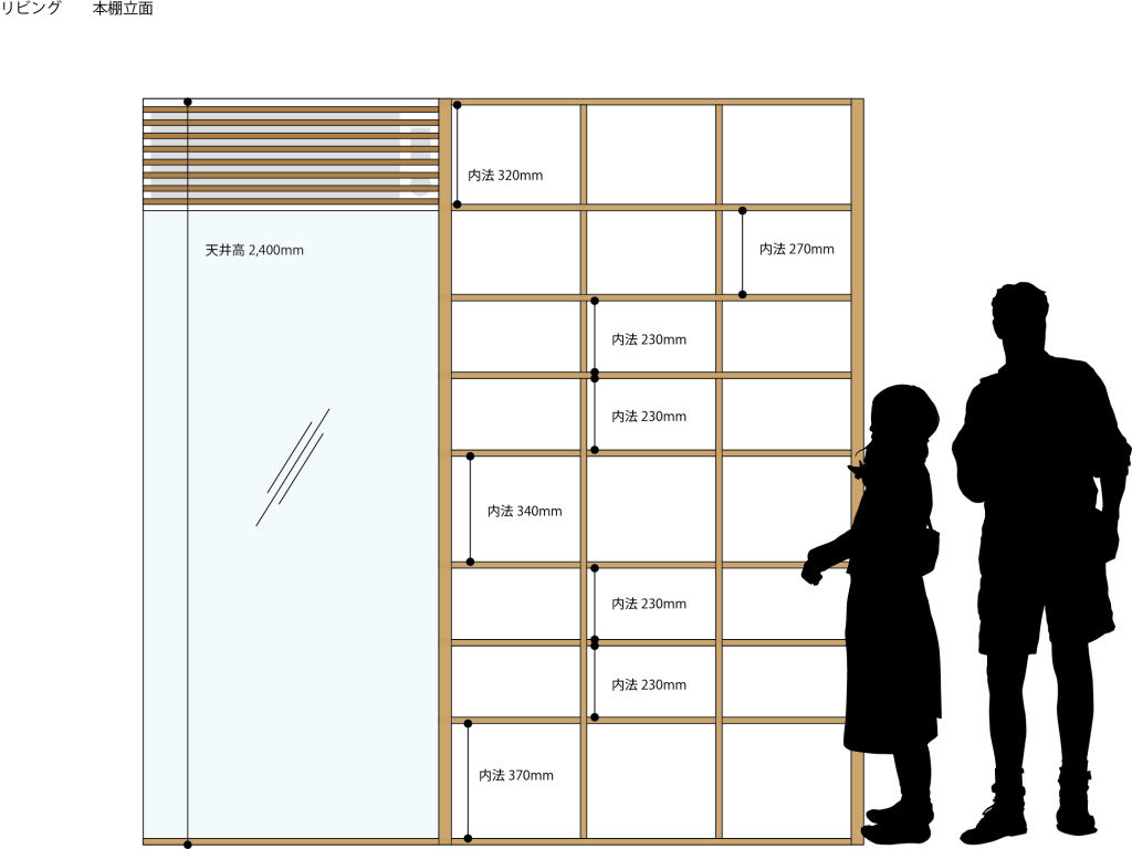 私の家でこだわったポイントは、本棚を造作で作った点です。特に、A4サイズのファイルや漫画本、B4サイズの本など、一重に本と言っても、高さがことなります。そこで、私たちは、以下のように納めたい本の種類によって内寸を分け、特に雑誌や生活に関する様々な記録簿やファイルを保管しておく場所を一番手元に近く取りやすい場所に設け、その上下に漫画を保管する場所、一番下は荷重のかかるB4サイズの本の保管やCDコンポが設置できるような寸法とする工夫をしました。
