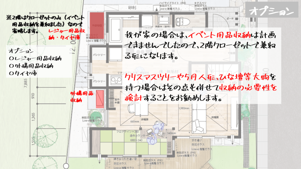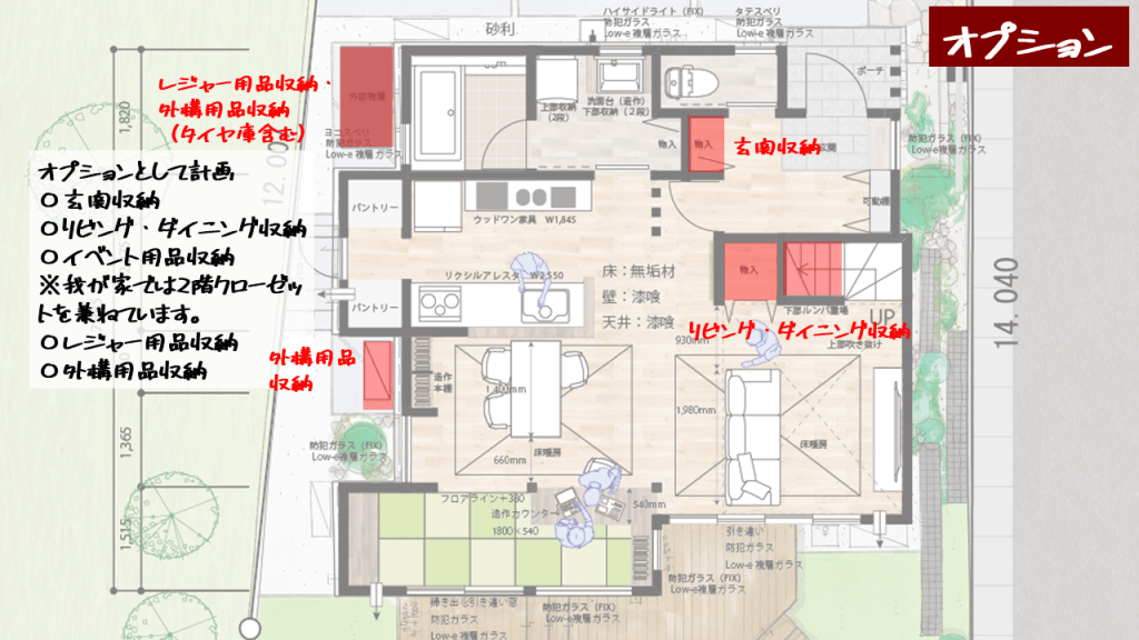 オプションとして検討していく収納は、玄関収納、リビングダイニング収納、イベント用品収納、レジャー用品収納、外構用品収納になります。順番にご説明していきます。