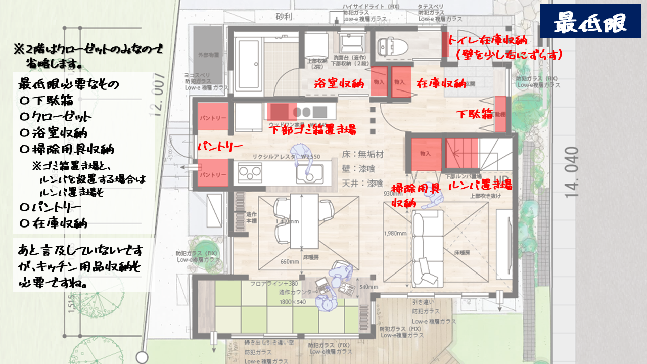 まず、収納には、大きく大別して、下駄箱、玄関収納、浴室収納、リビングダイニング収納、パントリー、在庫収納、掃除用具収納、クローゼット、イベント用品収納、レジャー用品収納、外構用品収納、だいたいこの程度の種類が存在します。この中で、下駄箱、クローゼット、浴室収納、掃除用具収納、パントリー、在庫収納あたりはそれなりに確保する必要があり、それ以外はオプションとして検討していくことで、収納を効果的に計画していくことができます。