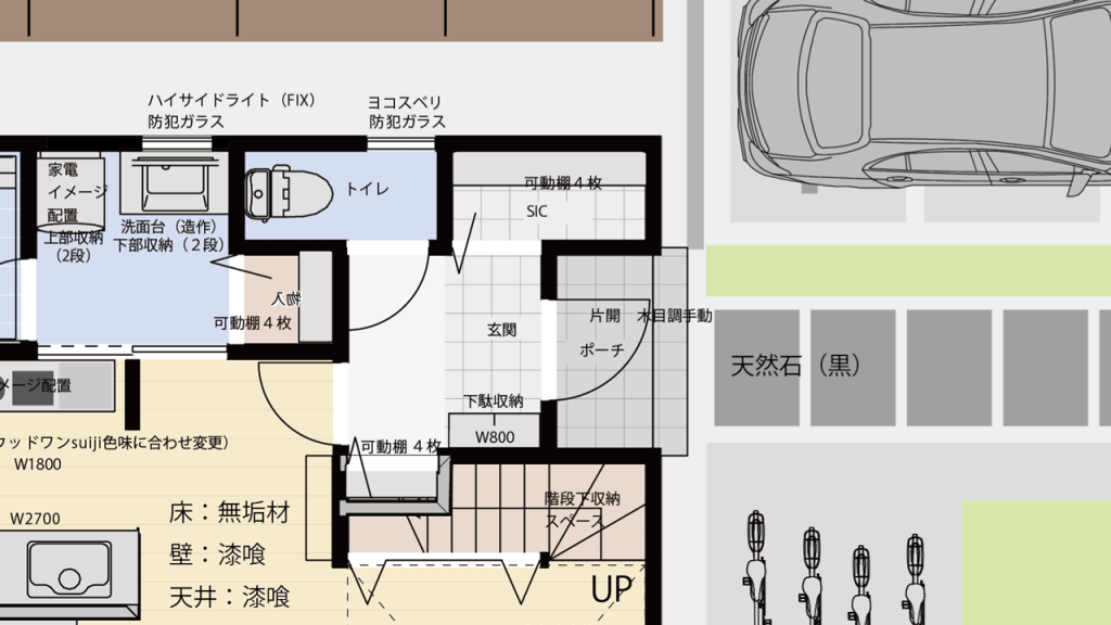 ちなみに我が家では、最初はベビーカー置き場やハンガーパイプ等の設置を想定した玄関収納を想定しておりましたが、ベビーカーを使う期間も数年間であるのと、窓を設けて明るい玄関を作るのを優先したいと考えるようになり、玄関には、在庫収納を設けるのみといたしました。