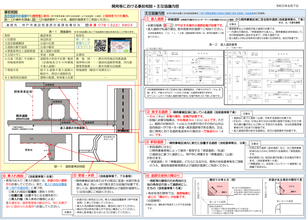 他方、都市計画法に基づいた整備ではありますが、開発許可申請手続きにて整備された道路の場合は、私道となるケースが存在します。開発許可申請手続きは、民間事業者が開発計画を立案し、行政の許可を得て整備を行う事業でありますが、この許認可の際に、行き止まり道路であっても開発許可が下りるケースが存在します。開発許可基準は各自治体の裁量に任せられておりますので、どのような場合に許可がおり、またどのような場合に私道となるかの差は多少の程度はありますが、行き止まり道路を採用する場合は私道となる場合がほとんどかと思います。以下神戸市HPからの抜粋ですが、このように行政が独自に基準を設けております、下図の一点鎖線の開発事業区域のような道路であれば、開発区域の両端に道路があり、通過交通が見込まれますので、公道として行政に引き取ってもらえます。