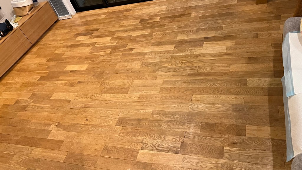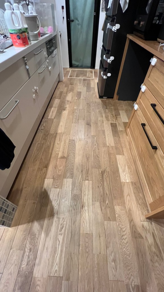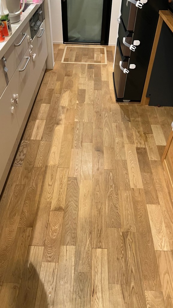 入居してから2年半、やろうやろうと思ってもまだ良いかと思い続けた結果、LDKの無垢床が2箇所無垢床が剥がれたので、これはまずいと思い、剥がれた箇所を補修し、急遽無垢床にオイル塗りを行いました。